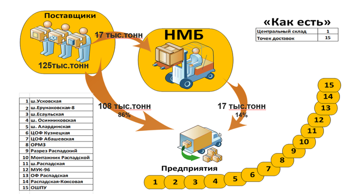 Вторым шагом — полностью отказаться от крупной распределительной материальной базы. Весь грузопоток направился напрямую на склады управляемых предприятий.