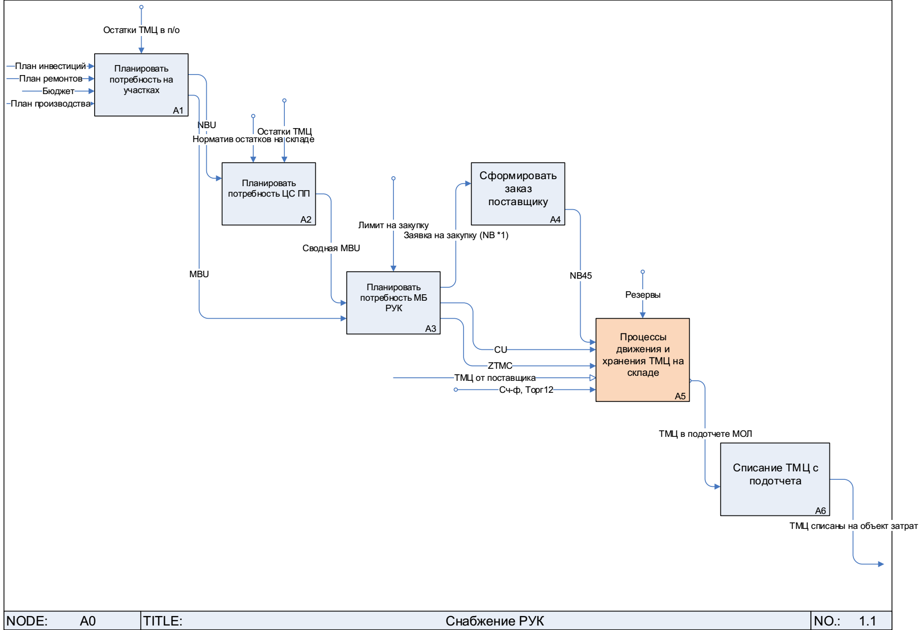 Чтобы оценить масштабность изменений, мы использовали верхнеуровневую диаграмму процесса снабжения (см. рис. 4). Процессы верхнего уровня, как правило, не меняются, не дублируются, не пересекаются, поэтому их удобнее отображать в аннотации IDEF0. Основная задача диаграммы верхнего уровня — показать, что все процессы направлены на достижение единого результата. На диаграмме красным подсвечен процесс А5 «Процессы движения и хранения ТМЦ на складе». Именно в этом процессе должны были произойти изменения. Таким образом, мы локализовали масштаб изменений, и это сделало наши дальнейшие шаги более уверенными.