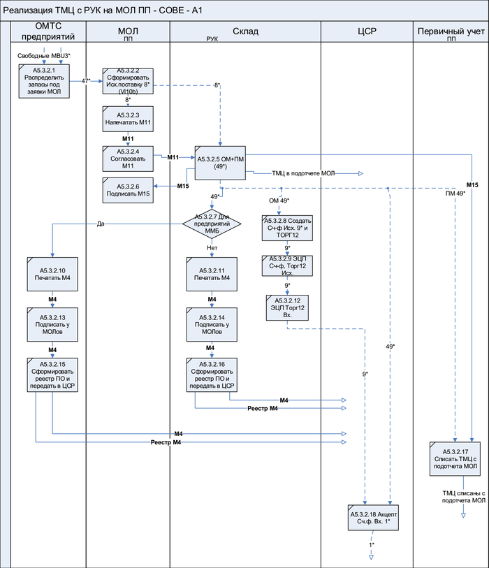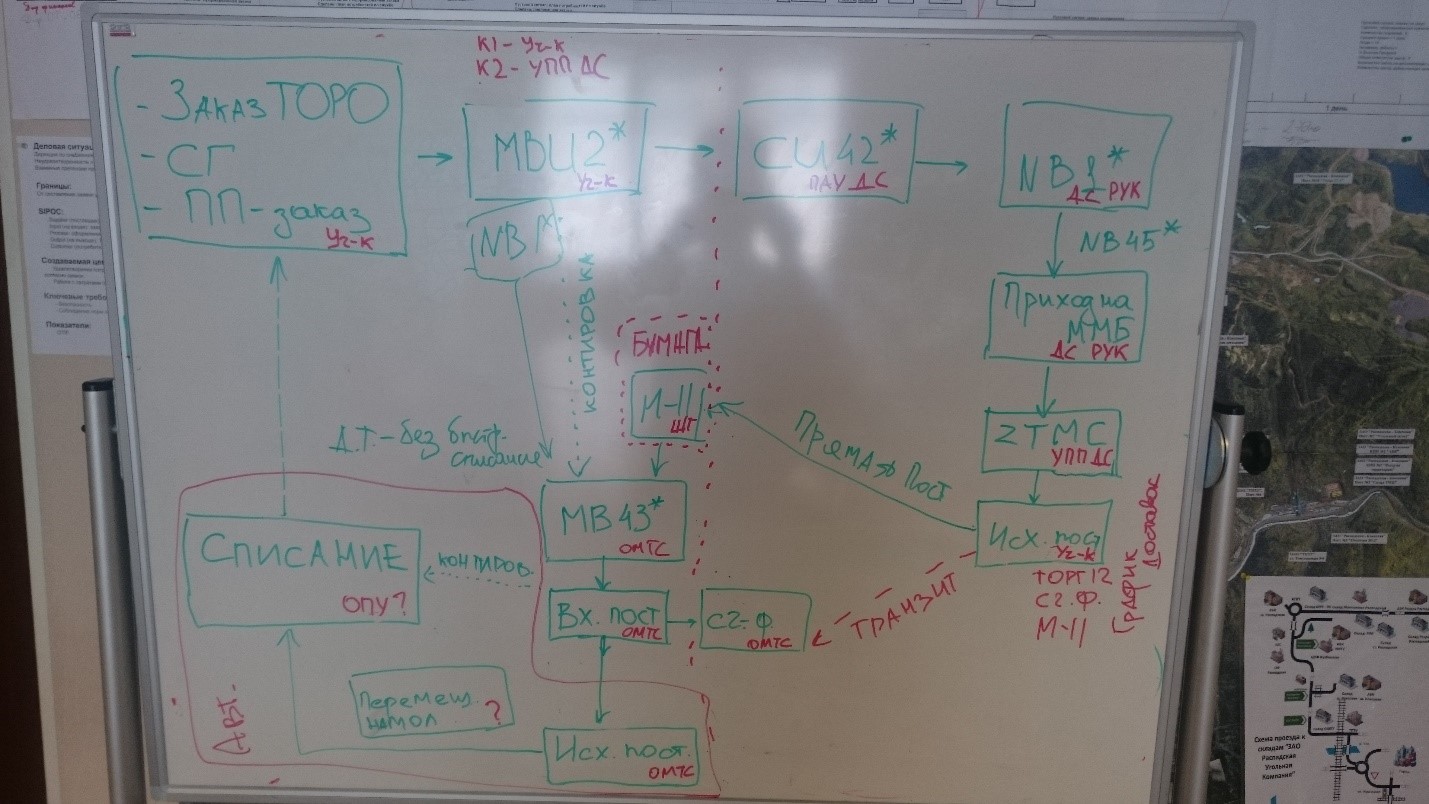 Каждый вариант поставки был проиндексирован. Например, если Поставщик поставляет материалы на материальную базу — смотри схему А0. Так мы поняли, сколько схем нам предстояло описать — 8 схем поставки и 2 схемы по перемещению. Сплошное описание процессов вовсе и не требовалось.