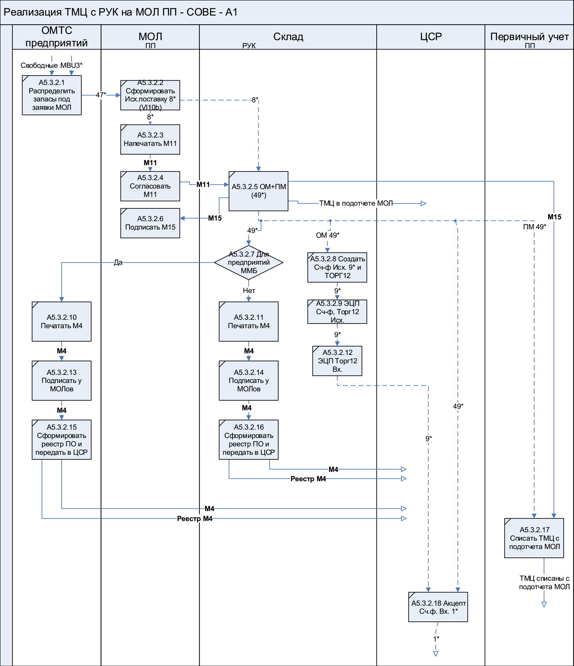 До начала проекта оптимизации системы снабжения выдача ТМЦ сопровождалась перемещением ТМЦ в подотчет получателю. Но в целевой модели процесс перемещения превратился в процесс купли-продажи, поскольку Заявитель ТМЦ теперь получал ТМЦ не со склада своего предприятия, а со склада «чужого» ЮЛ (управляющей компании). По своей сути это напоминает приобретение ТМЦ в магазине, но только не в розницу, а между двумя ЮЛ с последующим выставлением Счета-фактуры и оплатой по нему. Операция купли-продажи более трудоемкая по сравнению с операцией перемещения ТМЦ. Замеры показали, что в среднем общее время на перевыставление транзитного счета-фактуры уходит 15 дней (от 5 до 30 дней). Сама операция занимает в среднем 45 минут. Именно по этой причине процедура выдачи ТМЦ в производство становится объектом № 1 для оптимизации.