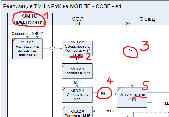 При описании деятельности предприятия на нижнем уровне мы использовали нотацию «Процедура» в Business Studio. На рисунке ниже красными цифрами отмечены особенности этой нотации, которые помогли нам в проекте.