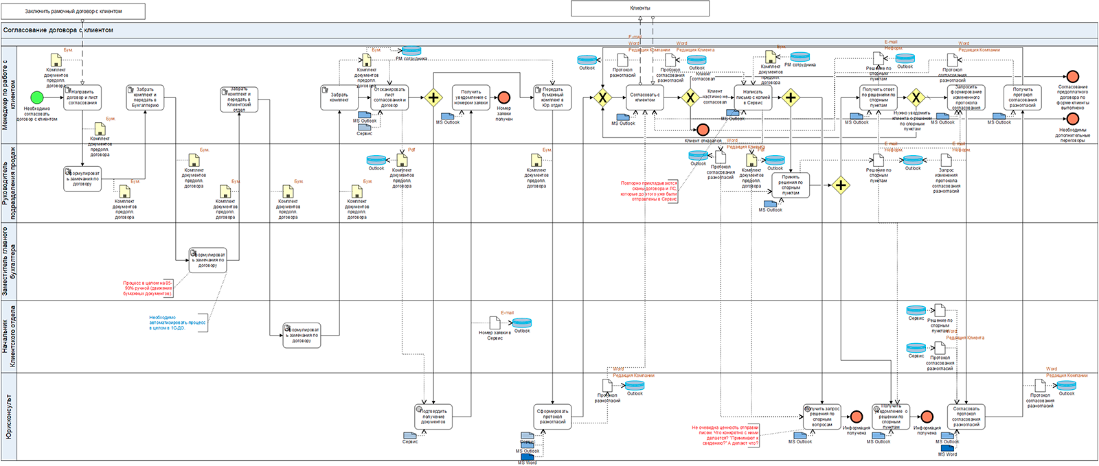 Помочь глубже понять процесс и сформулировать проблемы/гипотезы может моделирование (описание) процесса «Как есть» в нотации BPMN. Для того, чтобы создать аналитически полную схему процесса, целесообразно придерживаться определенного подхода, сформулированного в моих статьях «Методы визуального анализа графической схемы бизнес-процесса в нотации BPMN» и «Моделирование информационных потоков в нотации BPMN в Business Studio 5».