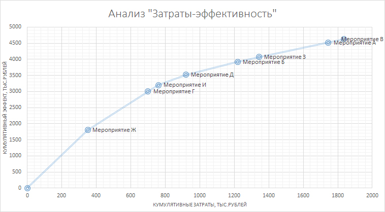 Далее все мероприятия ранжируются по критерию плановой эффективности, рассчитываются кумулятивные затраты и кумулятивный эффект, в MS Excel строится график «Затраты-эффективность» проекта. Пример графика представлен на рис. 4.