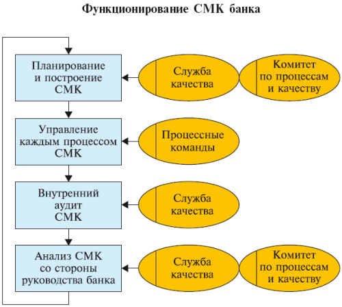 Многим банкам, которые только начинают построение СМК, будет полезно иметь информацию и примеры, как данная система должна функционировать. Это позволит заранее предусмотреть возможные сложности и недоработки, наиболее полно подстроить СМК под специфику банка, а также увидеть будущую выгоду от организация системы менеджмента качества. Функционирование СМК в банке — это процесс, поэтому при раскрытии темы статьи воспользуемся понятием процессного подхода.