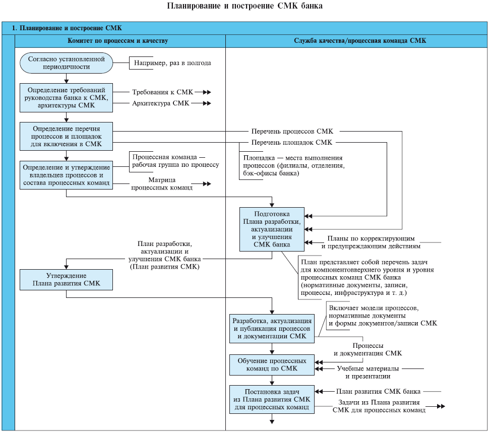 Для разработки, улучшения и актуализации процессов и документации СМК рекомендуется использовать типовую систему менеджмента качества коммерческого банка [3]. Она содержит необходимые для СМК банка процессы и образцы документов, а также другие примеры и успешные практики банковской деятельности.
