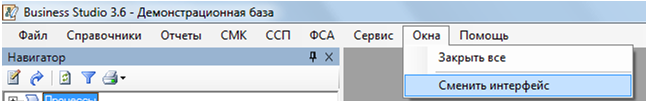 Для того, чтобы пользователи могли работать с созданными нами параметрами необходимо дать пользователям соответствующие права. Для этого в Business Studio, предварительно открыв нужную базу данных, воспользуемся командой «Сменить интерфейс» меню «Окна»