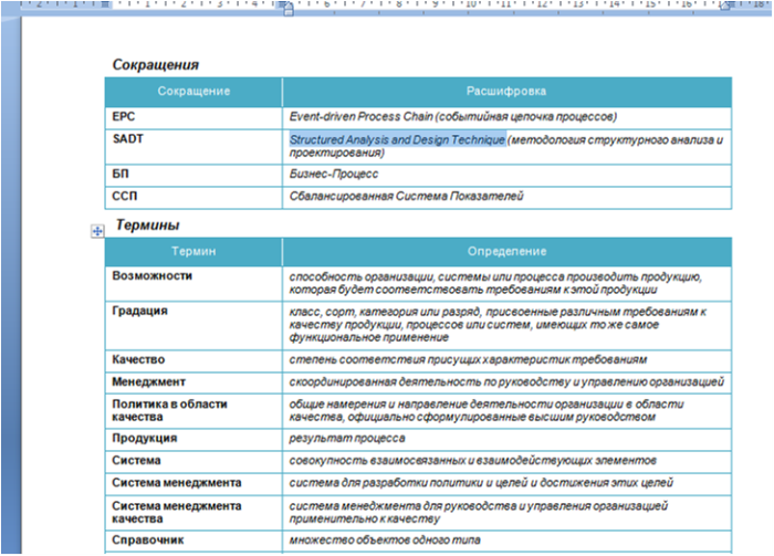 Рисунок 3. Фрагмент раздела «Термины и сокращения» стандартного отчета «Регламент процесса»