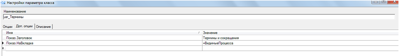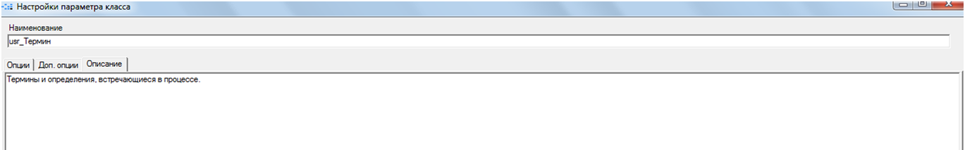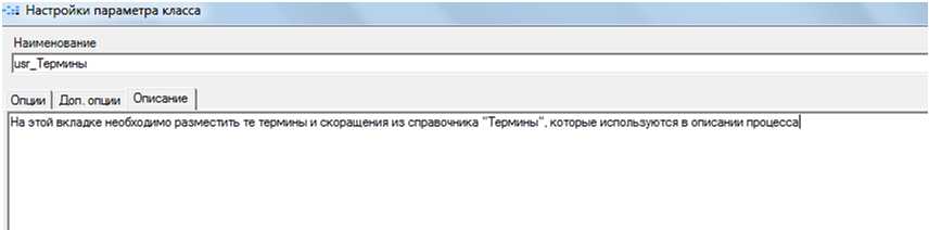 Теперь вернемся к параметрам класса «Процессы» и создадим там параметр «Термины» (Рисунок 9). Свойства этого параметра заполним так, как показано ниже (Рисунок 14, Рисунок 15, Рисунок 16).