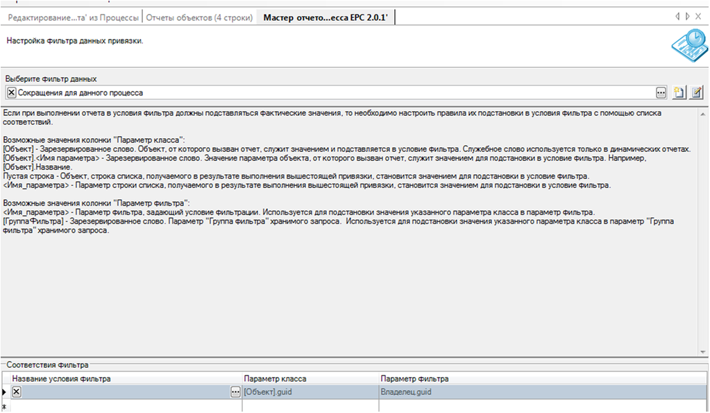 Самое время приступить к работе с шаблоном отчета: нам требуется организовать в регламенте процесса место для вывода интересующей нас информации. Вместо раздела «Термины и определения» я создал два раздела «Термины» и «Сокращения», в каждый из которых добавил привязку типа фильтр, соответствующую разделу.