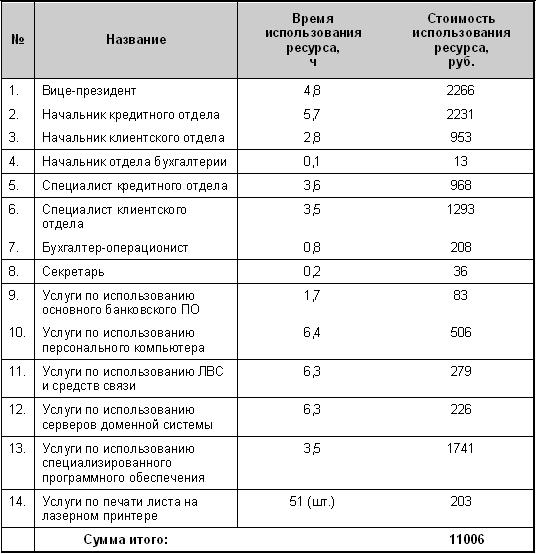 Средние суммарные затраты на оформление одного кредитного досье с учетом описанных выше работ, рассчитанные с использованием метода ФСА, приведены в таблице: