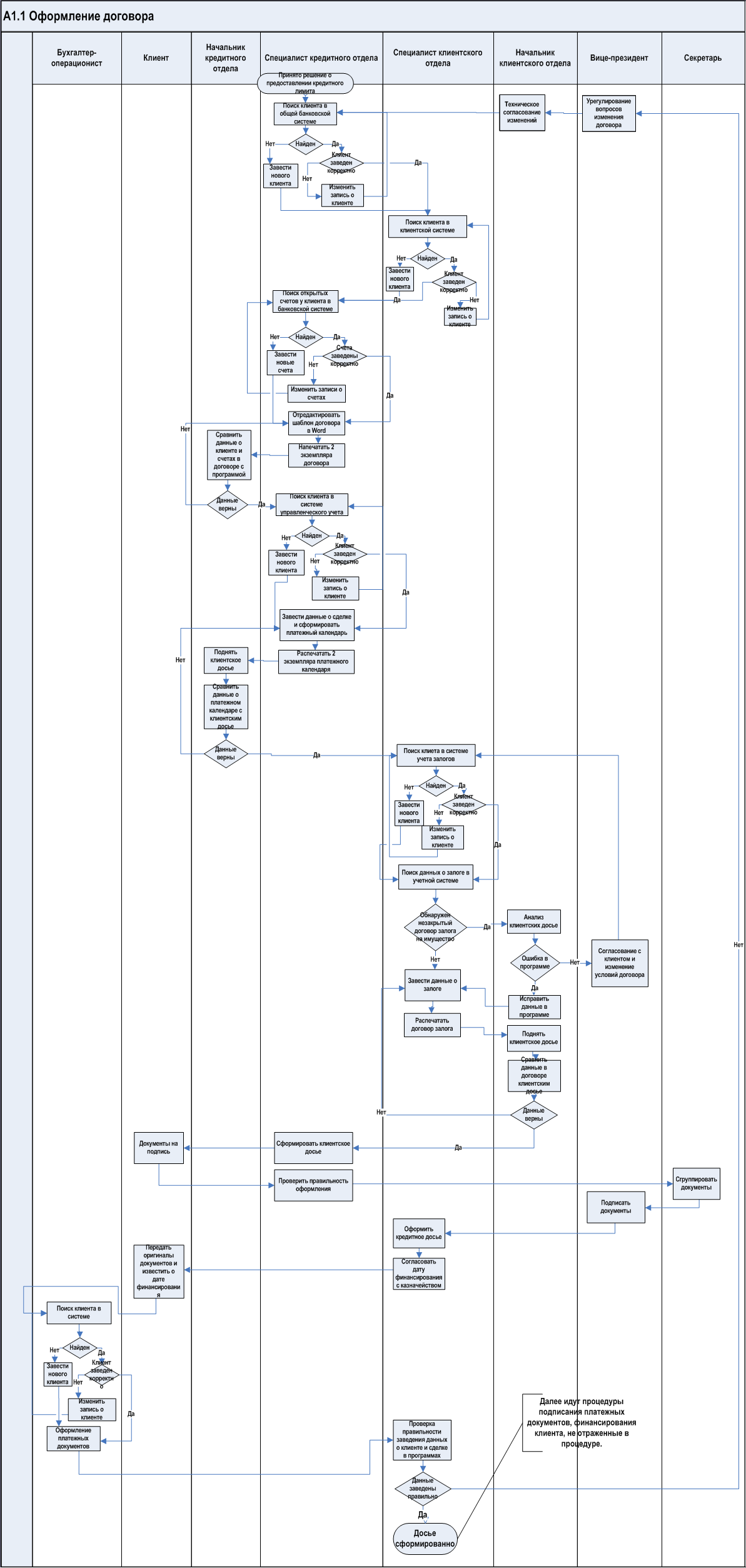 Стоит особо отметить, что сложности процессу, изображенному на карте, явно предают работы, связанные с проверкой и внесением исправлений. Это является следствием того, что банк использует несколько информационных приложений для осуществления этой простой операции. Данные заносятся вручную, поэтому регулярно возникают ошибки, примерно в 10% досье. Прежде всего, это неточности, связанные с занесением одних и тех же данных (ФИО клиента, юридический адрес, паспортные и регистрационные данные и проч.) в разные программы с отклонениями от оригинала. Ошибки такого рода (например, в паспортных данных клиента), попавшие в подписанный договор займа или залога могут стать причиной серьезных финансовых и репутационных потерь для банка, например, клиент может отказаться от исполнения своих обязательств перед банком. Исправление такого рода неточностей на различных стадиях оформления досье требует привлечения как сотрудников смежных подразделений с целью уточнения, что это действительно ошибка, а не другой клиент с похожими данными, так и руководителей различного уровня с целью согласования возникших изменений внутри банка.
