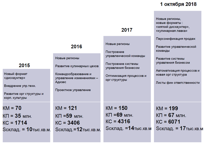 Развитие компании выполняется в соответствии с утвержденным стандартом, определяющим требования к типовому проекту открытия новых магазинов различных форматов. Внедрение этого стандарта, включающего и типовые модели магазинов, и проверочные листы для оценки качества выполненных строительных работ, сократило средний срок открытия нового магазина с