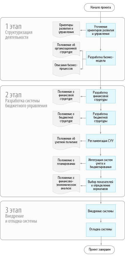 На втором этапе закладываются методические основы будущей системы (количество и структура центров финансовой ответственности, бюджетная структура, набор статей бюджетов).