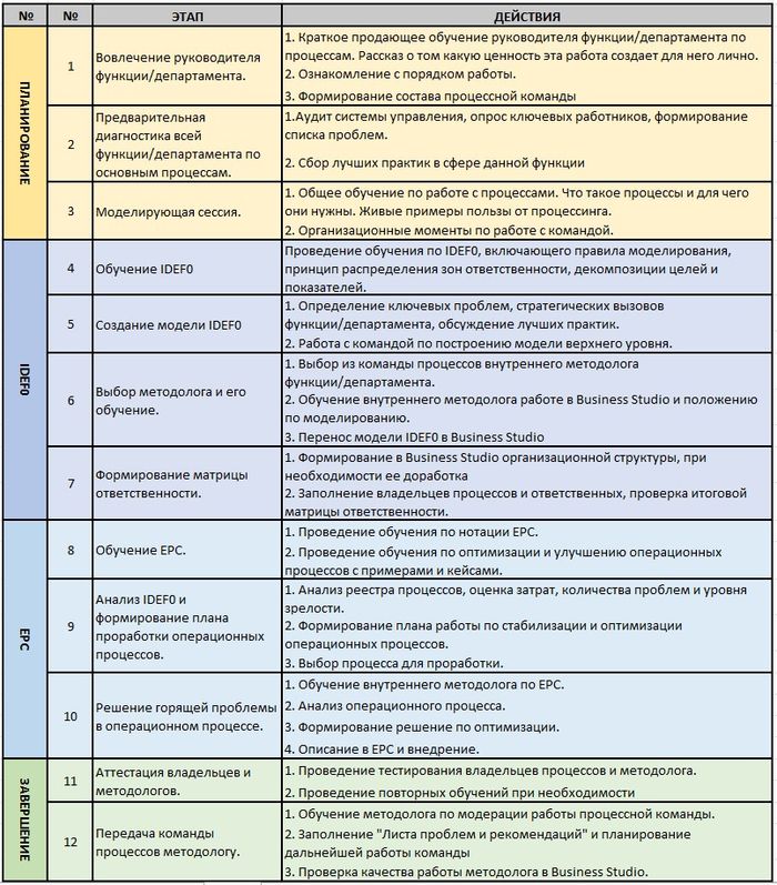 После формирования процессная команда проходит через типовую последовательность этапов: обучение, проработка функционально-процессной модели IDEF0, оптимизация операционного процесса и формирование программы развития для самостоятельной работы. Параллельно с работой команды обучается внутренний процессный методолог, вносящий информацию в Business Studio и координирующий работу по улучшению процессов.