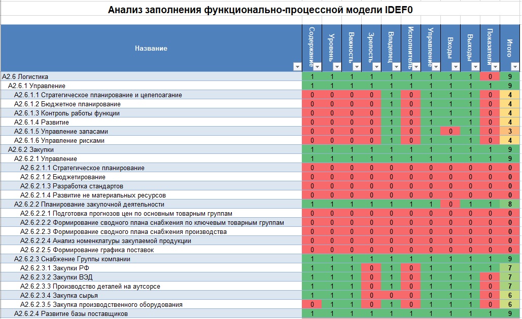 - Отчет «Анализ модели IDEF0 на соответствие положению о моделировании», который в одной таблице показывает, насколько правильно и по каким критериям заполнены элементы группы процессов.
