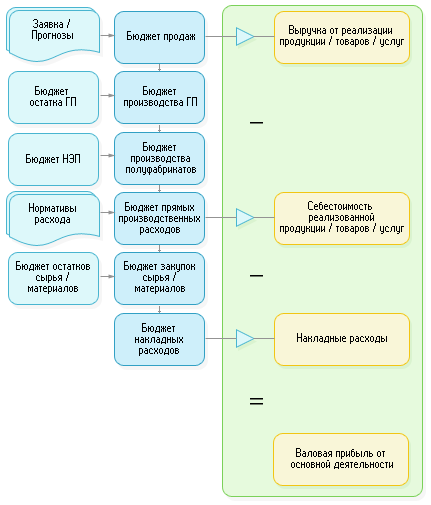 Для составления логической схемы функциональных бюджетов необходимо использовать процессную модель предприятия. Доработка процессной модели заключается в выделении тех потоков, которые могут быть представлены (запланированы) в виде бюджетов, и в указании логических взаимосвязей между этими бюджетами. Таким образом, в результате получается схема, сопоставляющая бюджеты и процессы, а также формирующая график составления и корректировки бюджетов.