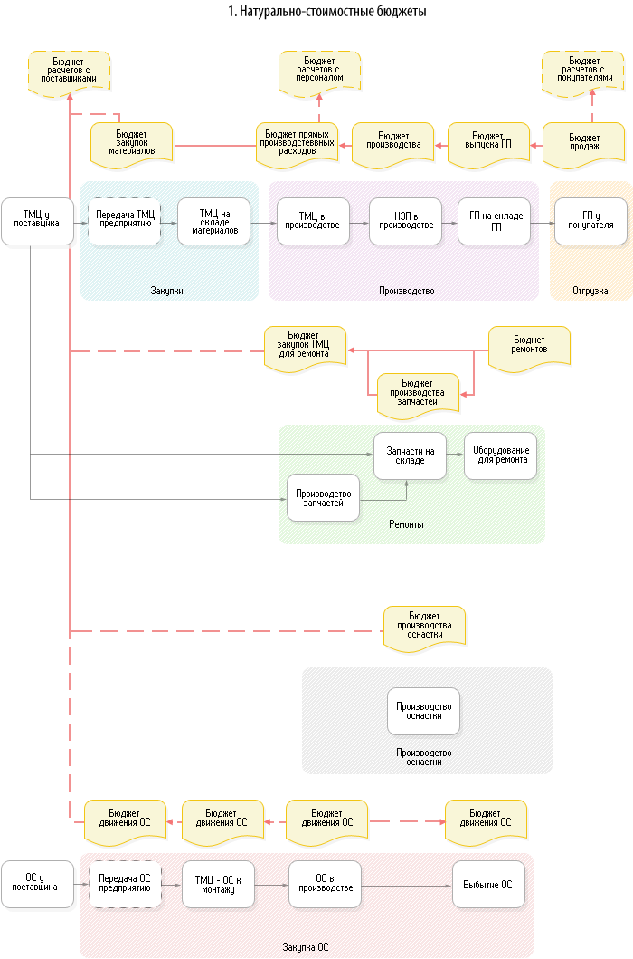 Для составления логической схемы функциональных бюджетов необходимо использовать процессную модель предприятия. Доработка процессной модели заключается в выделении тех потоков, которые могут быть представлены (запланированы) в виде бюджетов, и в указании логических взаимосвязей между этими бюджетами. Таким образом, в результате получается схема, сопоставляющая бюджеты и процессы, а также формирующая график составления и корректировки бюджетов.