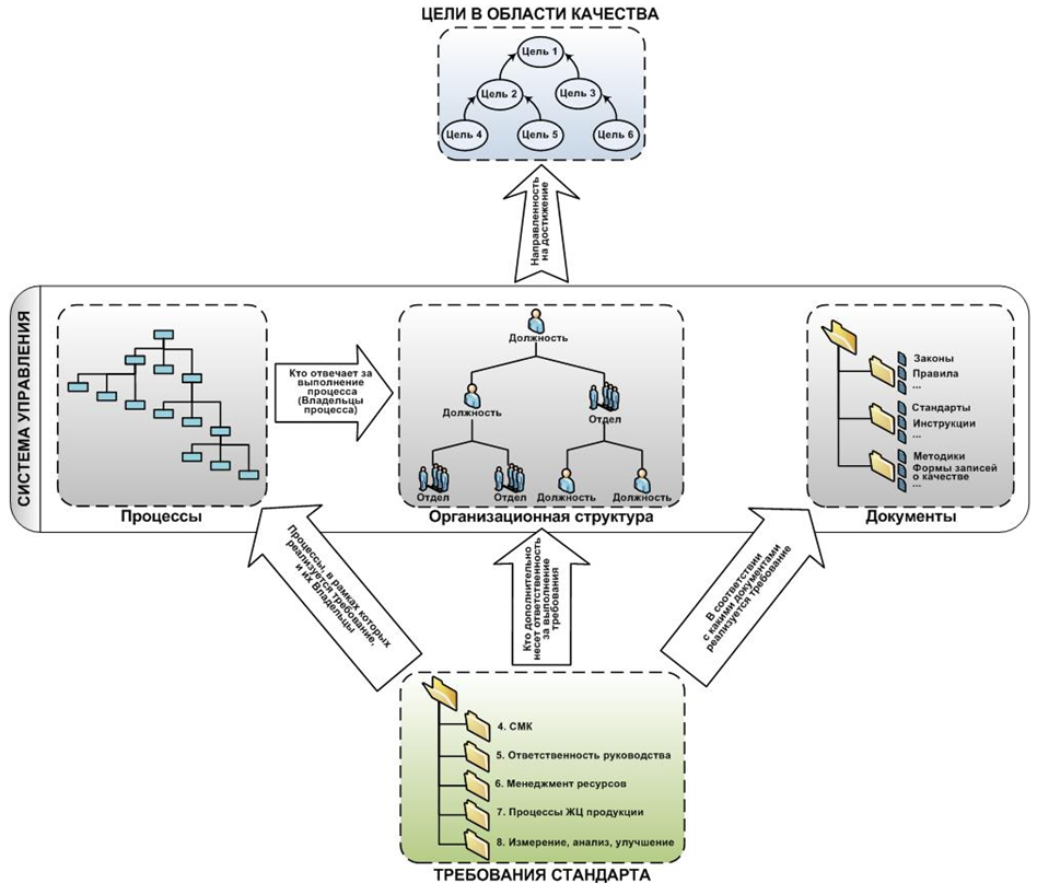 В итоге мы должны получить документ, в котором описано, как требования стандарта выполняются в действующей системе менеджмента качества, как взаимодействуют между собой ее основные объекты. А именно: при выполнении каких процессов или какой деятельности реализуются эти требования, в каких документах это все описано, и кто несет ответственность за реализацию этих требований.
