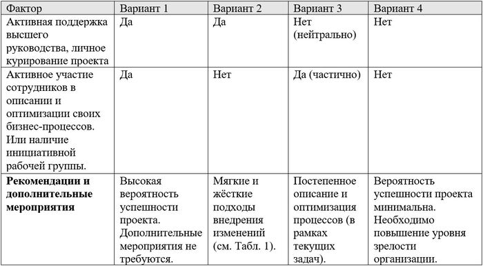 Если проанализировать опыт большого количества организаций, то можно выделить два наиболее часто встречающихся фактора, влияющих на успешность проекта и достижение запланированных результатов. В зависимости от комбинации этих факторов есть 4 варианта, благодаря которым можно понять, к какому из них относится организация, и какие действия необходимо предпринять — см. Табл. 2.