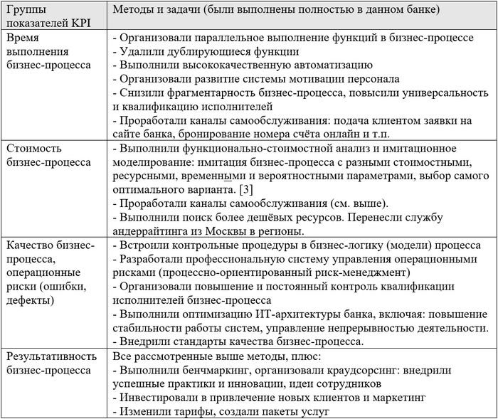 Табл. 1. Методы улучшения показателей KPI при оптимизации бизнес-процесса