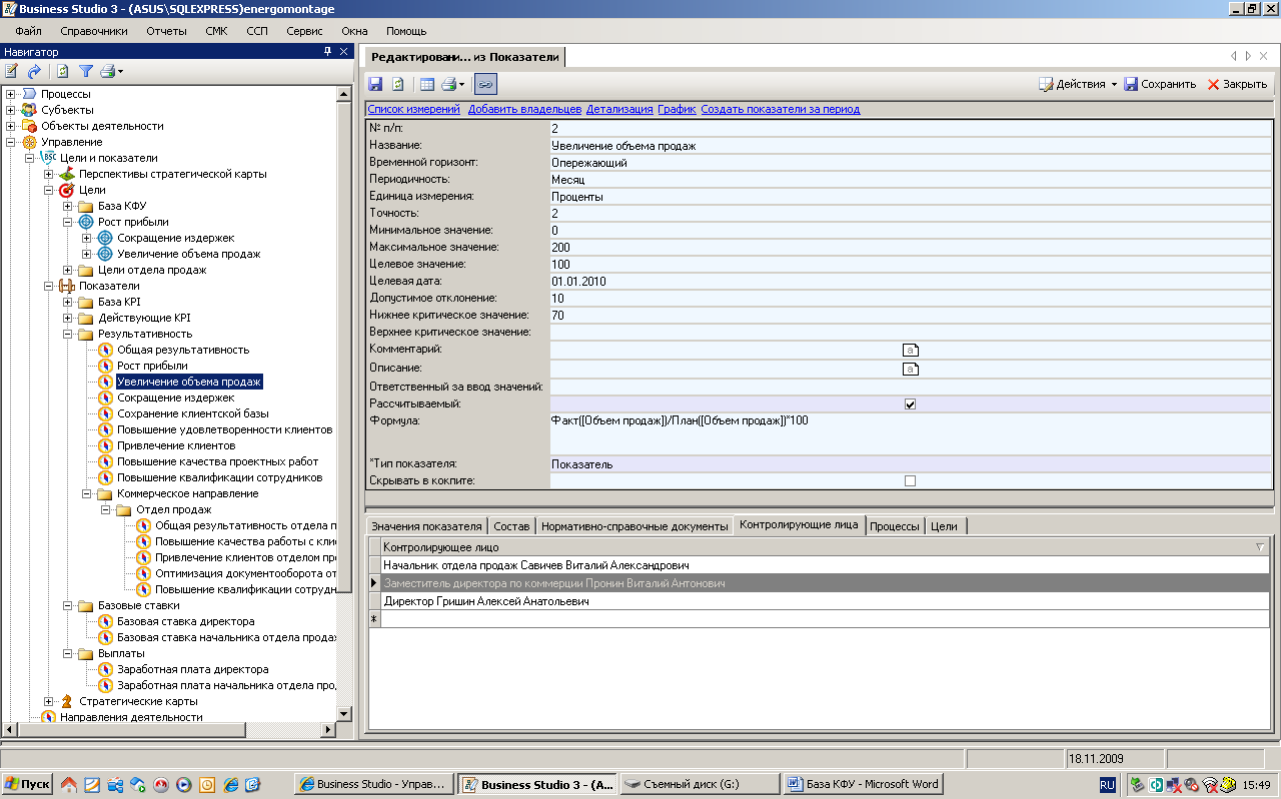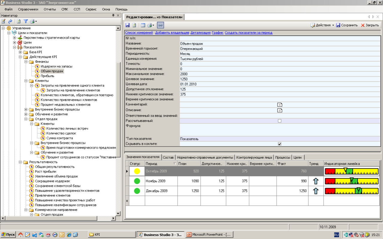 Из свойств показателя мы можем заключить, что объем продаж к январю 2010 года (целевая дата) ежемесячно должен составлять 1 250 тыс. рублей (целевое значение). Движение к этому целевому значению мы будем отслеживать ежемесячно (периодичность) путем контроля за достижением планового значения (план) показателя для каждого месяца.