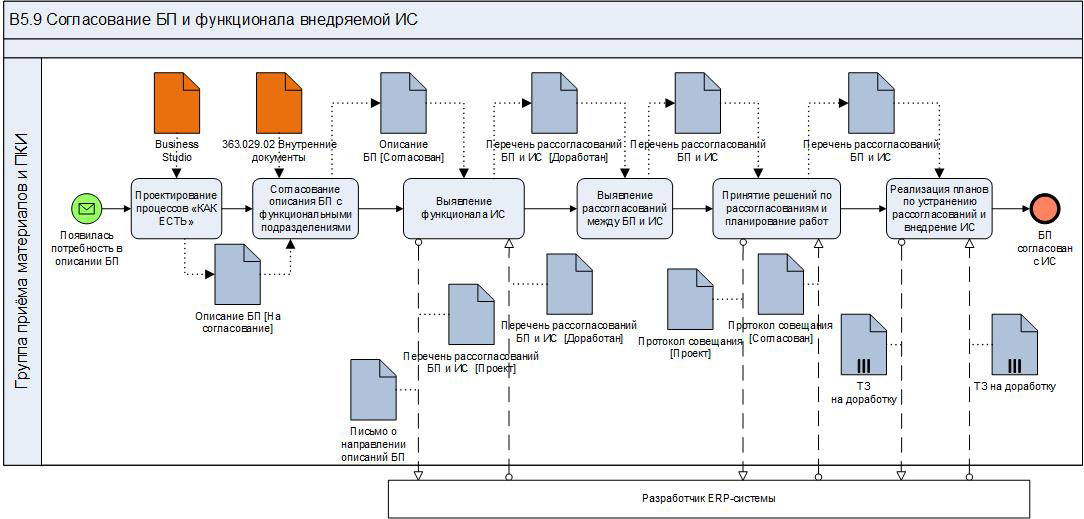 Согласование бизнес-процессов и функционала ПО начинается с того, что, используя имеющуюся информацию, строится схема бизнес-процессов, подлежащих автоматизации, с которыми в дальнейшем и будет проводиться работа. Немаловажным, и достаточно весомым по временным затратам, является шаг согласования схемы описанного процесса с его владельцем и действующими лицами. Для данного согласования в системе бизнес-моделирования формируется специальный отчёт «Описание процесса BPMN», содержащий в себе визуальную схему процесса, информацию об исполнителях, владельцах процесса, документооборот и описание каждого подпроцесса. Согласование документа осуществляется в системе электронного делопроизводства действующим на предприятии порядком. В процессе согласования документ может возвращаться на доработку его создателю и видоизменяться.