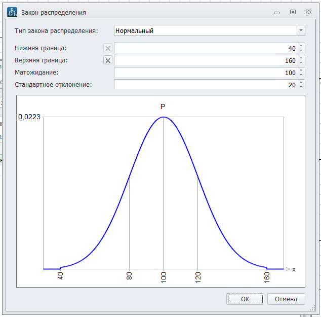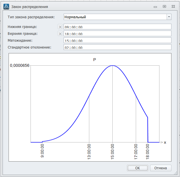 На рис. 5. показано распределение времени выполнения операций процессов. Видно, что матожидание времени выполнения составляет 10 минут.