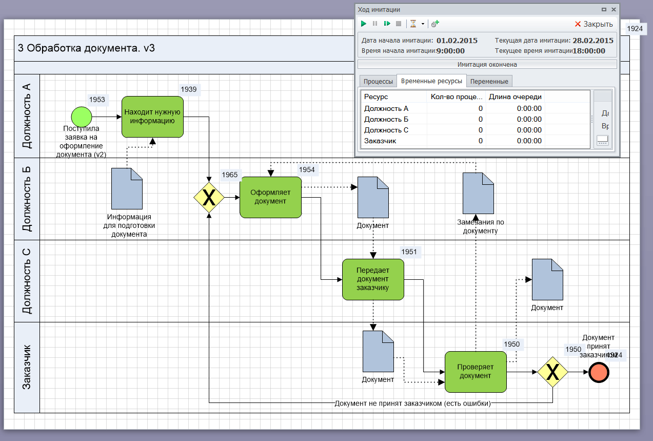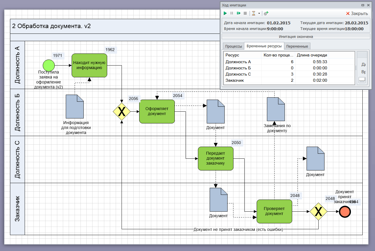 На рис. 2 видно, что практически все заявки были выполнены. Длина очереди почти нулевая. Это означает, что численность по два сотрудника на каждой должности является оптимальной численностью для получения результата данного процесса (документ выдается «в течение 1 рабочего дня с момента подачи заявки» и даже быстрее). При этом мы, конечно, не учитывали прогулы, пьянки и беременность.