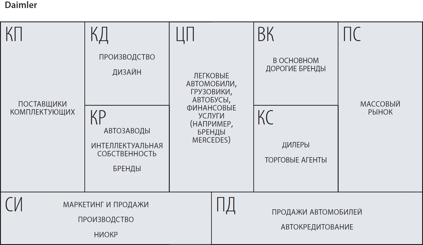 Рисунок 2. Пример бизнес-модели компании Daimler из книги «Построение бизнес-моделей», А.Остервальдер и Ив Пинье