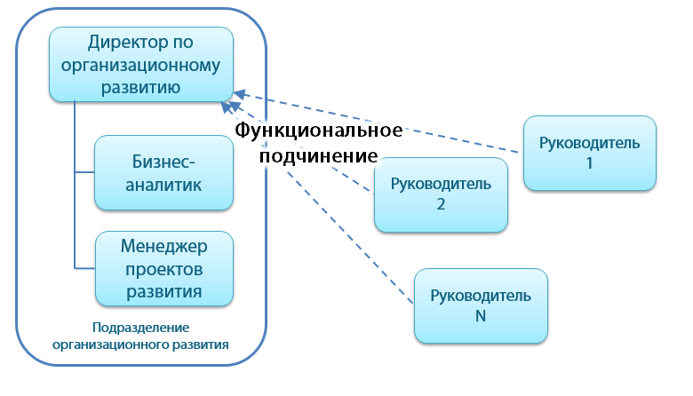 Для координации деятельности по организационному развитию в компании, тем не менее, должно существовать подразделение организационного развития (в зависимости от размера компании — департамент, управление или отдел), директор которого выполняет, как минимум, две роли: