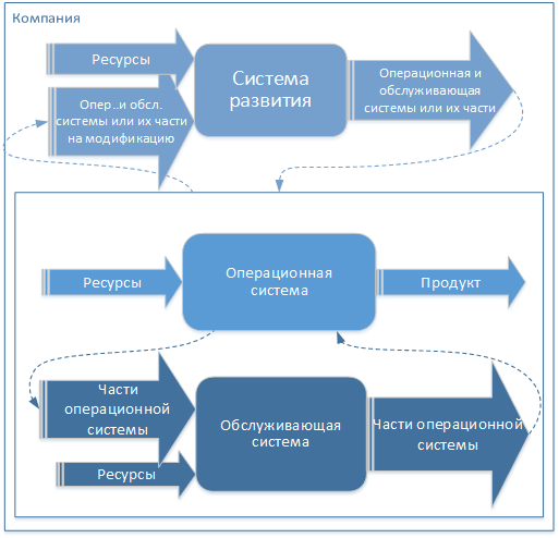 - Систему развития, целью которой является проектирование продуктов и создание операционной и обслуживающей систем или, иными словами, собственно организационное развитие.