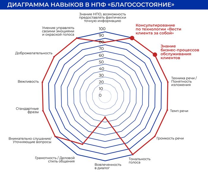 60–70% прямой коммуникации клиентов с фондом приходится на общение по телефону. Далее идет личный прием в офисе, персональные консультации и презентации на предприятиях, письменные обращения. Фонд обслуживает клиентов всех возрастов, и именно это определяет разнообразие используемых каналов коммуникации. Для контроля качества работы телефонных операторов мы используем традиционный для колл-центров механизм калибровок: когда выборочные звонки прослушиваются кураторами и оператор получает обратную связь. Поскольку у нас бесскриптовый колл-центр, мы изначально расширили диаграмму навыков, включив, помимо качества речи, такие показатели, как знание продукта, свободное ориентирование в бизнес-процессах сопровождения и обслуживания клиентов и умение вести клиента за собой (эмоциональное и профессиональное лидерство). Вот так выглядит диаграмма.