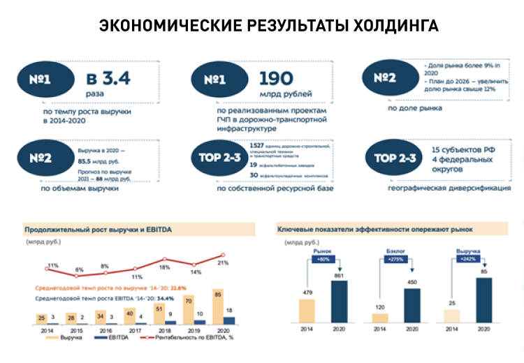 Показатели работы холдинга выше рыночных: с 2014 по 2020 год рынок вырос на 80%, а холдинг в части портфеля – на 275%, по выручке на 242%. Сегодня холдинг находится в топ-3 дорожных холдингов в России, входит в топ-200 предприятий Российской Федерации.