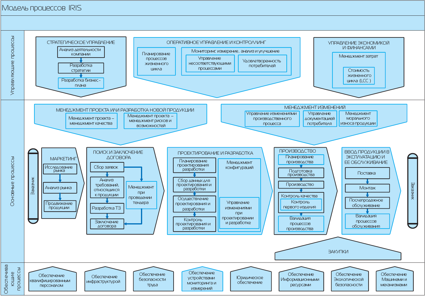 В последней редакции стандарта IRIS версии 0.2 установлено требование, что предприятие должно выделить и описать 25 процессов. Некоторые из этих процессов являются частью других процессов, так, например, процесс «Стоимость жизненного цикла (LCC)» является частью процесса «Менеджмент затрат», который в свою очередь может являться частью процесса «Управление экономикой и финансами». Причем последний не является обязательным согласно требованиям IRIS, но для полной картины деятельности предприятия, мы считаем целесообразным его идентифицировать.