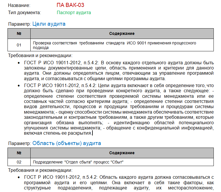 В таблице 1 представлен набор основных параметров аудита, однако для конкретных случаев этот перечень может быть модифицирован (исходя из потребностей заинтересованных сторон, среды организации и уровня компетентности участников).