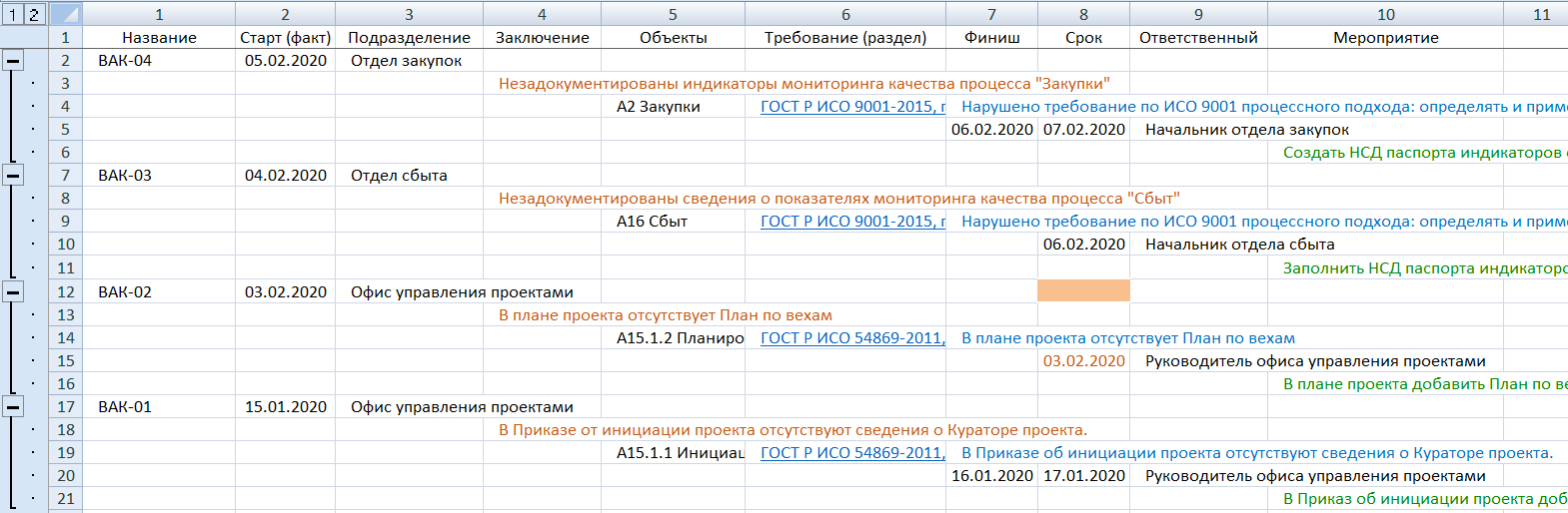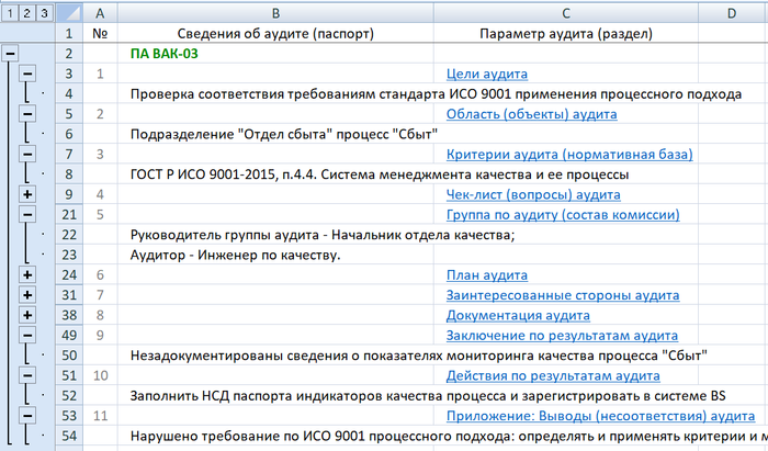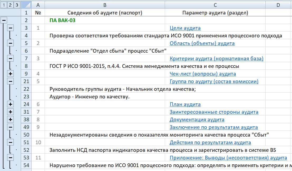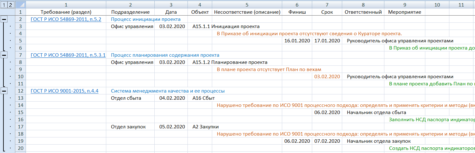 Лист «Несоответствия» представляет собой группировку аудитов по видам несоответствий и содержит следующие сведения (рис. 12):