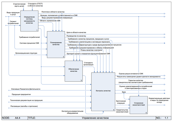 С учетом представленных выше сведений автором предлагается следующее графическое представление IDEF0-модели процесса «Управление качеством» (рис. 2), при этом в стандарте [4] отмечается, что деятельность по улучшению может осуществляться в различных формах — от постоянных незначительных (локальных) улучшений до существенных улучшений (в масштабах всей организации). С учетом указанной возможности этап «Улучшение качества» представлен операцией «Устранение несоответствий» в составе процесса «Управление качеством» и отдельной операцией «Инициация улучшений» в составе группы процессов СМК «Измерение, анализ и улучшение».