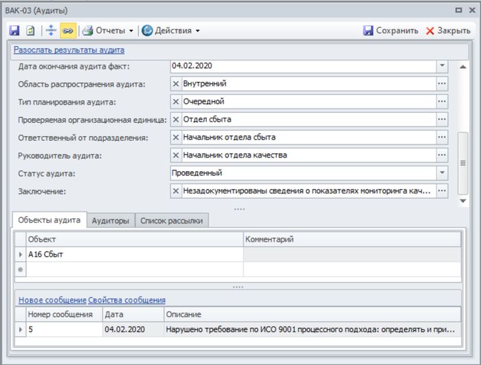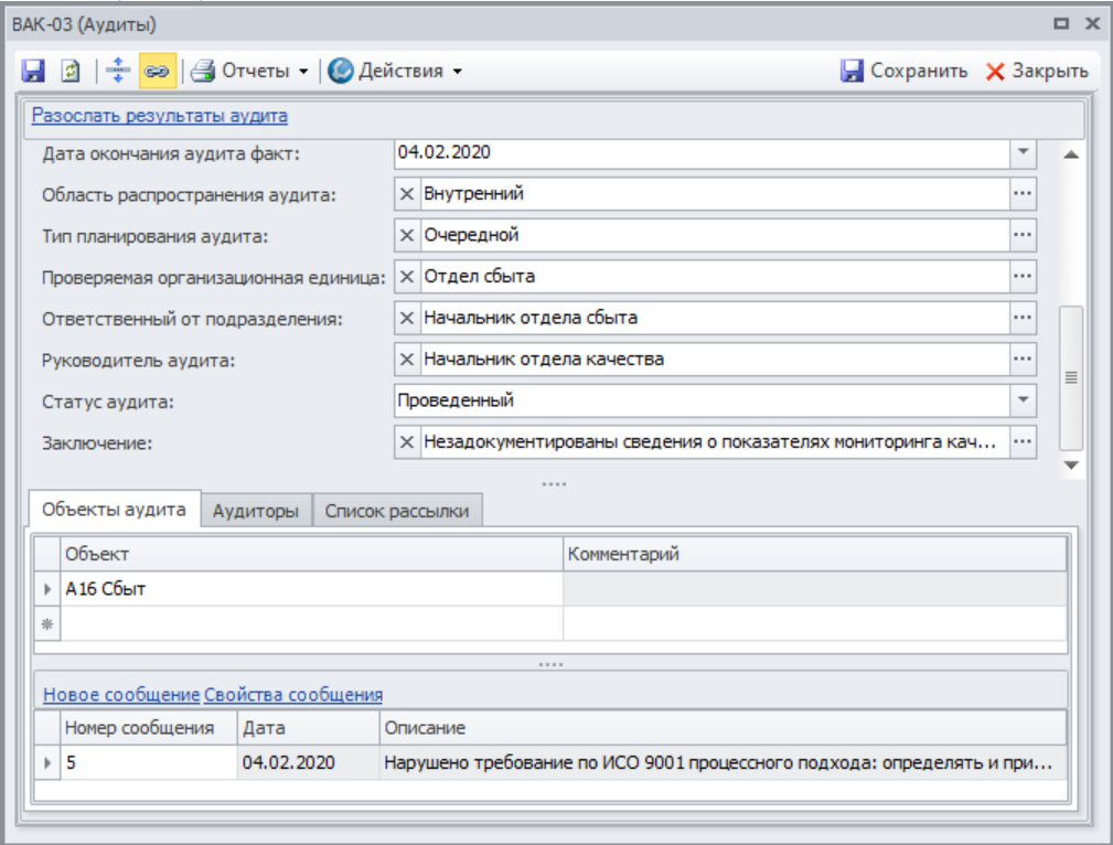 Для заполненной карточки аудита (рис. 5) может быть сформирован типовой отчет «Отчет о результатах аудита» (рис. 6).