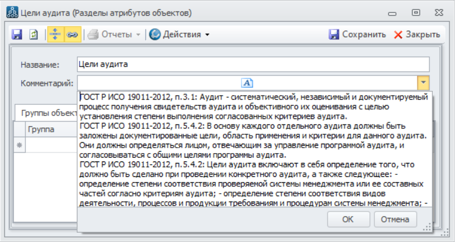 Использование справочника «Разделы атрибутов объектов» является удобным — в результате однократного заполнения сведений (и последующего их пополнения) можно многократно (автоматически) их выводить в отчеты для различных Паспортов аудита.