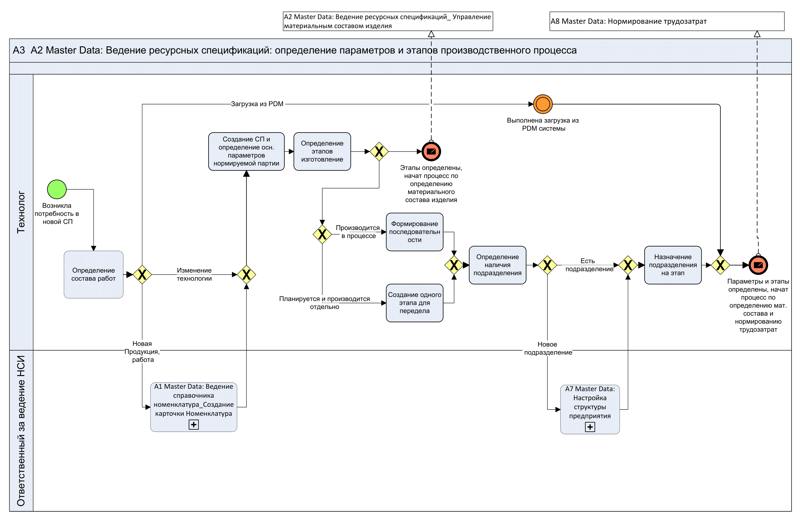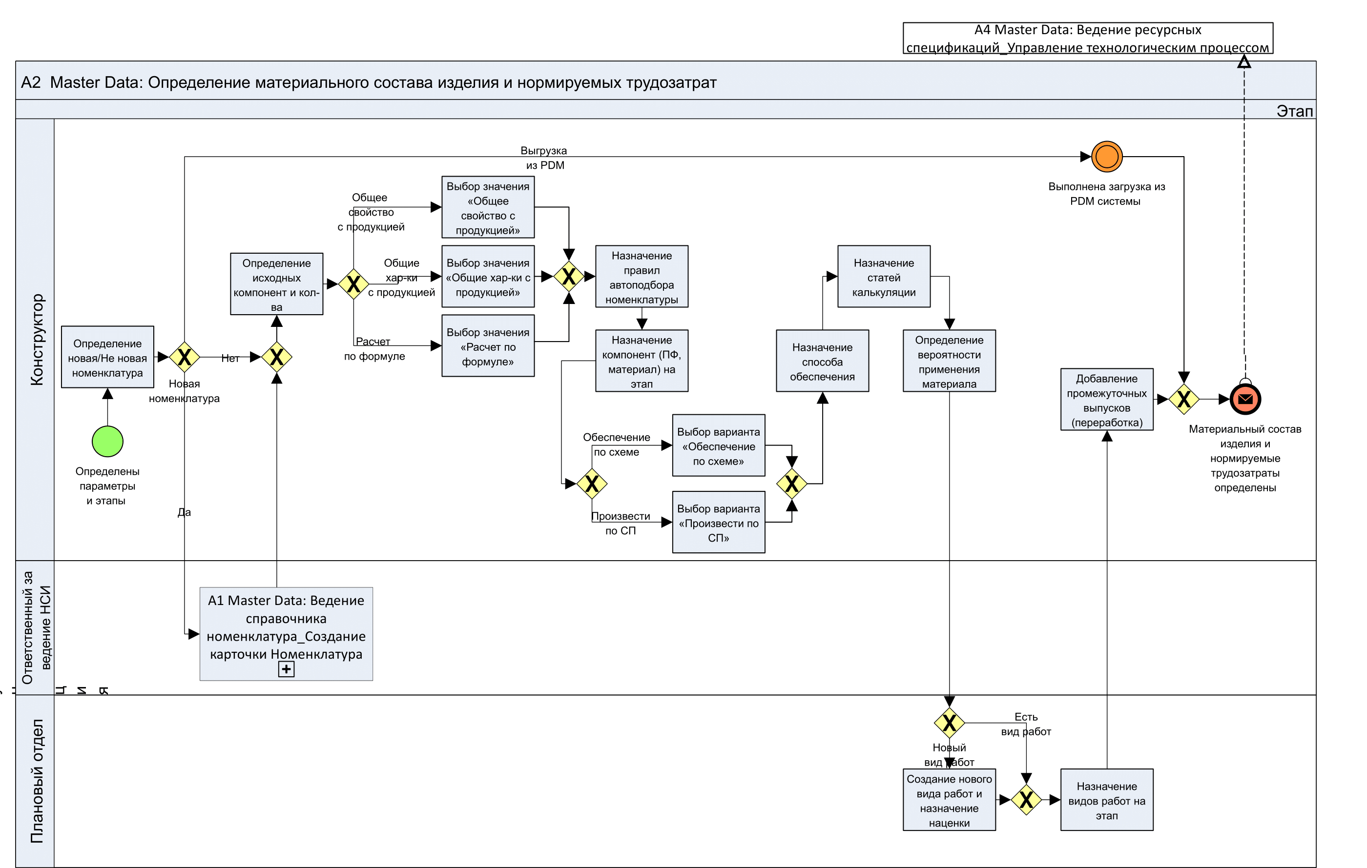 Об этих трёх диаграммах далее расскажем подробнее – уточним, что они представляют собой единую схему работ для технолога производства по наполнению НСИ с развилками, вариациями и ответственными лицами и говорят о том, какой реально должен быть объём НСИ, и какая степень погружения в этот процесс должна быть у технолога. На диаграммах были отображены четыре важные роли: технолог, планово-диспетчерский отдел (ПДО), плановый отдел и ответственный за ведение НСИ. По каждой роли были определены шаги, которые должны выполнять эти пользователи.