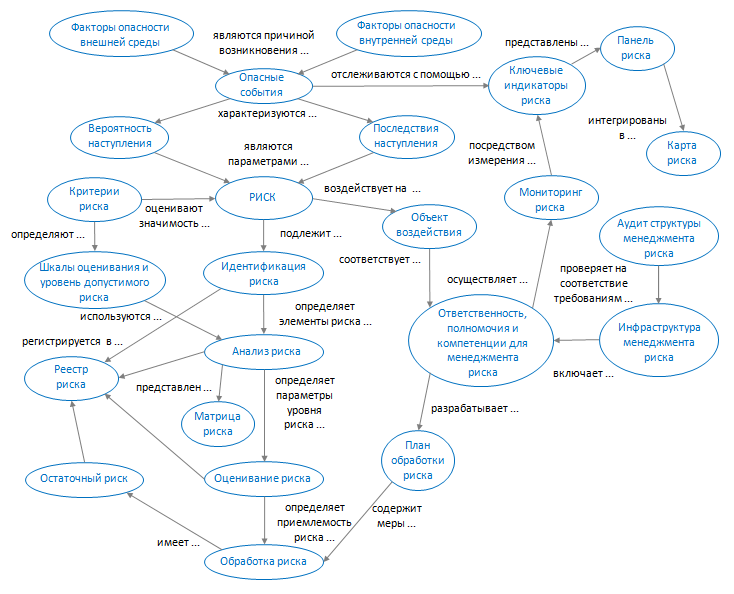Риск-менеджмент становится частью процесса принятия управленческих решений в условиях неопределенности [2], поэтому для повышения результативности и эффективности таких решений необходимо углублять знания и совершенствовать деловые качества в области управления рисками. Для обобщения сведений о принципах и подходах управления рисками, представленных в большом количестве стандартов, автор предлагает использовать модель в виде семантической сети, которая отражает структуру основных понятий этой предметной области (рис. 1).