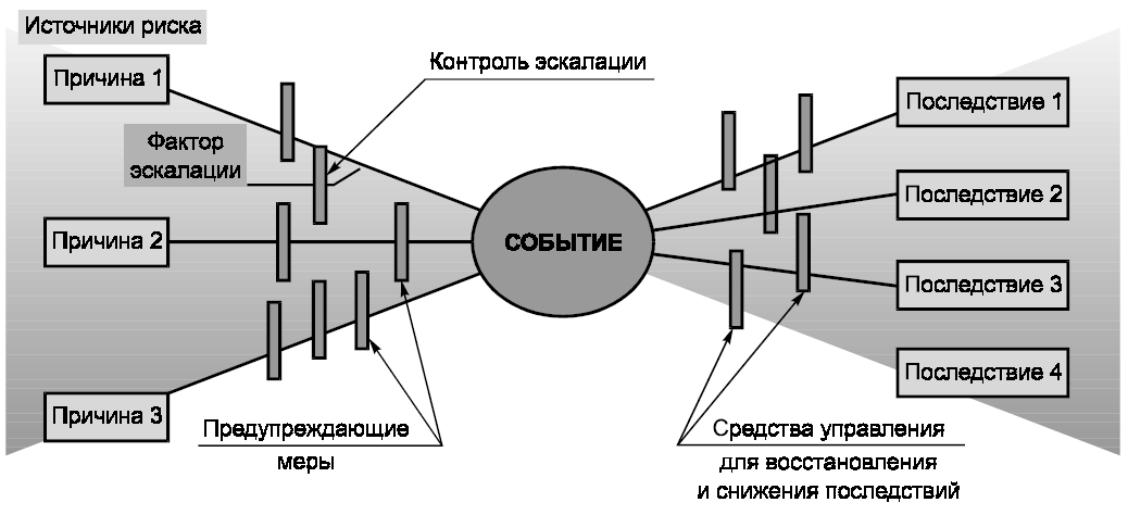 - установленные барьеры, предотвращающие эскалацию опасного события (предупреждающие меры на диаграмме слева) и нежелательные последствия (средства управления для восстановления и снижения последствий на диаграмме справа).