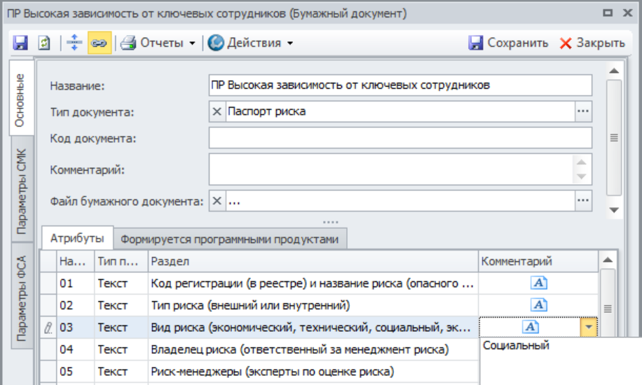 - содержание (значение) параметров риска заносится в поле «Комментарий» атрибутов документа;
