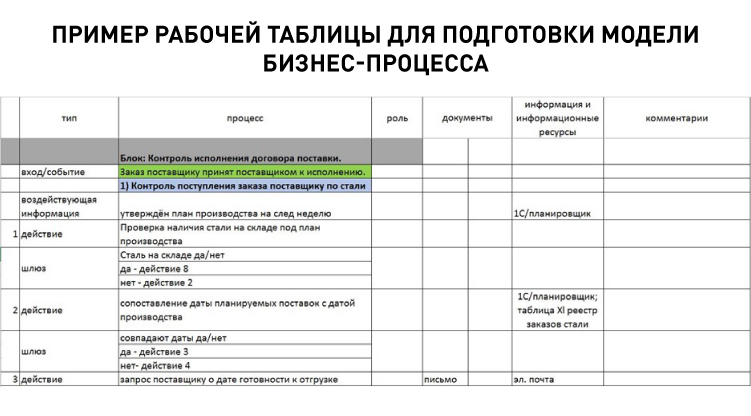 В ходе проекта эксперты бизнес-процессов проявляли активность. Например, эксперты бизнес-процесса «Снабжение» самостоятельно разработали таблицу, по которой готовились к встречам по моделированию.