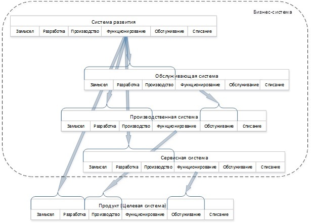 На схеме я отразил тот факт, что Система тиражирования бизнесов частично участвует в замысливании Продукта и Производственной системы. Если замысел оканчивается успешно, то она создает Систему развития, которая продолжает работу по созданию