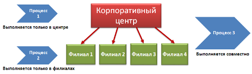 Одним из вариантов может быть использование такого алгоритма: определяя стандартные процессы, компания решает задачу по оптимальному распределению функций между центром и филиалами. Таким образом, каждый регламентированный процесс компании (управленческий, основной, вспомогательный), распределяется согласно правилу: выполняется только в центре, выполняется только в филиале, выполняется совместно. Очевидно, что процессы, выполняемые только в центре, являются стандартными и должны быть регламентированы. При выполнении процессов на обоих уровнях обычно бывает целесообразно также их стандартизировать и регламентировать. Для процессов уровня филиала возможно либо стандартизировать выполнение процесса — если все филиалы похожи, либо сделать стандартной отчетность по процессу — если выполнение процесса в разных филиалах может существенно отличаться.