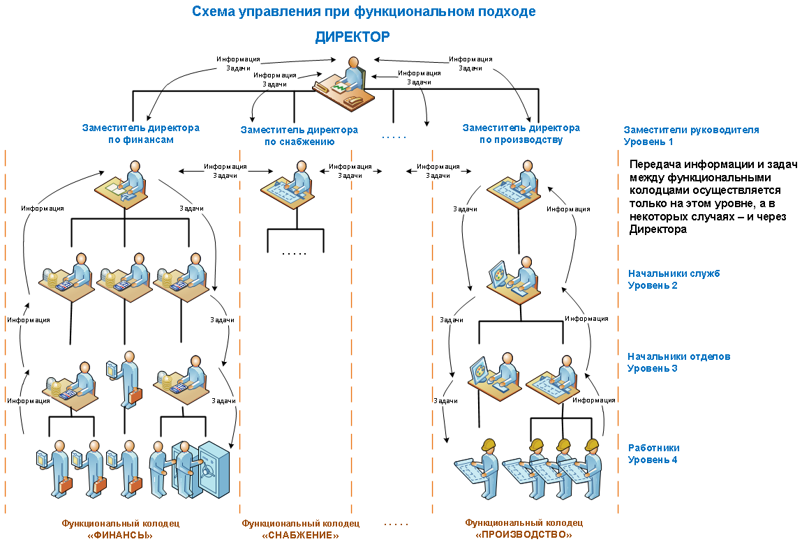 Решением проблем, присущих функциональному управлению, является переход к процессному управлению: всю деятельность, безотносительно того, к какому функциональному признаку она относится, группируют в смешанные подразделения, где каждый исполнитель отвечает за свой блок операций. Принципиальным различием этих подходов является переход от управления ФУНКЦИОНИРОВАНИЕМ организации (и ее структурных подразделений, объединенных на основе ПРЕДМЕТА деятельности: бухгалтерия, юротдел, снабжение, сбыт