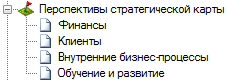 Справочник "Перспективы стратегической карты" позволяет хранить перспективы, по которым группируются стратегические цели при построении диаграмм стратегических карт. Чаще всего используют четыре перспективы (Рис. 2), однако, всегда можно добавить новую перспективу.