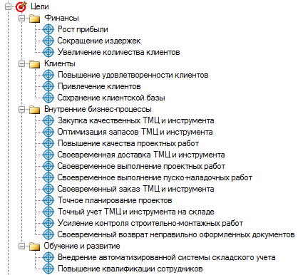 Справочник "Цели" позволяет хранить стратегические цели. Цели можно сгруппировать по папкам (Рис. 3).