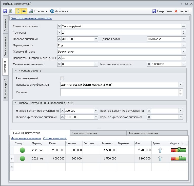 Если для показателя определена формула, а для какого-то периода занесены значения в список измерений, то за данный период фактическое значение этого показателя будет рассчитываться как среднее значений списка измерений, а плановое значение − по указанной формуле в свойствах показателя. При необходимости рассчитывать по формуле и фактическое значение - необходимо удалить все измерения в списке измерений за рассматриваемый период.